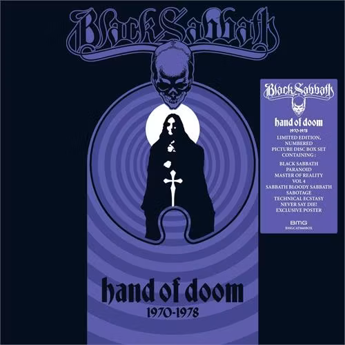 Comprising some of Black Sabbath’s most powerful albums ever produced, HAND OF DOOM features the Complete Original Black Sabbath 1970-1978 collection on picture disc for the first time. The highly collectible set contains the band’s self-titled debut (1970), as well as the multi-platinum Paranoid (1970), the platinum albums Master Of Reality (1971), Vol. 4 (1972), and Sabbath Bloody Sabbath (1973), the gold-certified Sabotage (1975), alongside Technical Ecstasy (1976) and Never Say Die! (1978). The boxed set includes each album’s artwork printed on Side A. The self-titled debut, Vol. 4, Technical Ecstasy, and Sabbath Bloody Sabbath feature the original back album artwork on Side B. Paranoid, Master of Reality, and Sabotage features an album-era photo of the band. The collection also includes a large color poster of the band taken in Los Angeles during the summer of 1972 whilst the band were recording Vol. 4